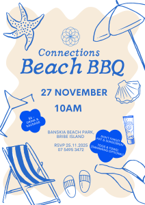 Beach BBQ! For participants who receive community access supports – you’re invited to join us for our monthly outing! We are headed to Banskia Beach on stunning Bribe Island, for a lovely day at the beach! $5 will get you a snag and a cold drink!