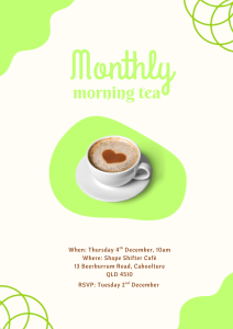For those participants currently receiving community access supports – Come along to our monthly morning tea. Get to know other participants and workers and enjoy a nice morning out.